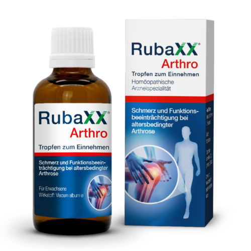 Rubaxx Arthro ist eine rezeptfreie Arzneispezialität in Tropfenform, die speziell für Schmerz und Funktionsbeeinträchtigung bei altersbedingter Arthrose entwickelt wurde. Der in Rubaxx Arthro enthaltene Wirkstoff Viscum album entstammt der Weißbeerigen Mistel und ist auch bekannt als potenter Wirkstoff in der begleitenden Krebstherapie. Er bekämpft Arthrose dort, wo sie entsteht: Im Inneren des Körpers und wirkt dabei schmerzlindernd. Mehr noch: Der Wirkstoff kann durch den apoptotischen Zelltod sogar bestimmte Körperzellen stoppen, die den Gelenkknorpel bei Arthrose angreifen.2 Somit wird der Knorpel geschützt und die bei Arthrose typischen Anlauf- und Belastungsschmerzen werden bekämpft.